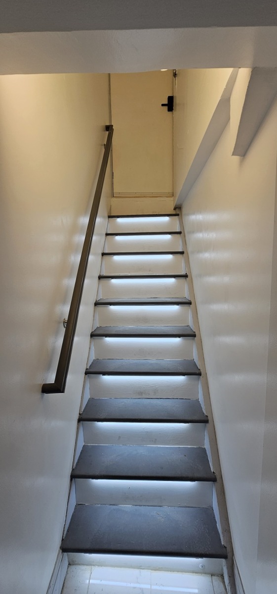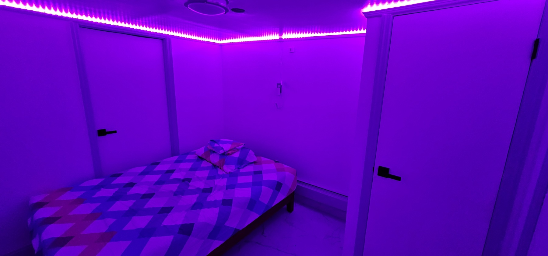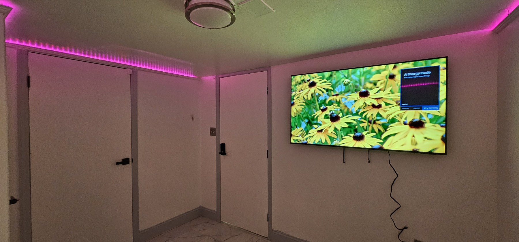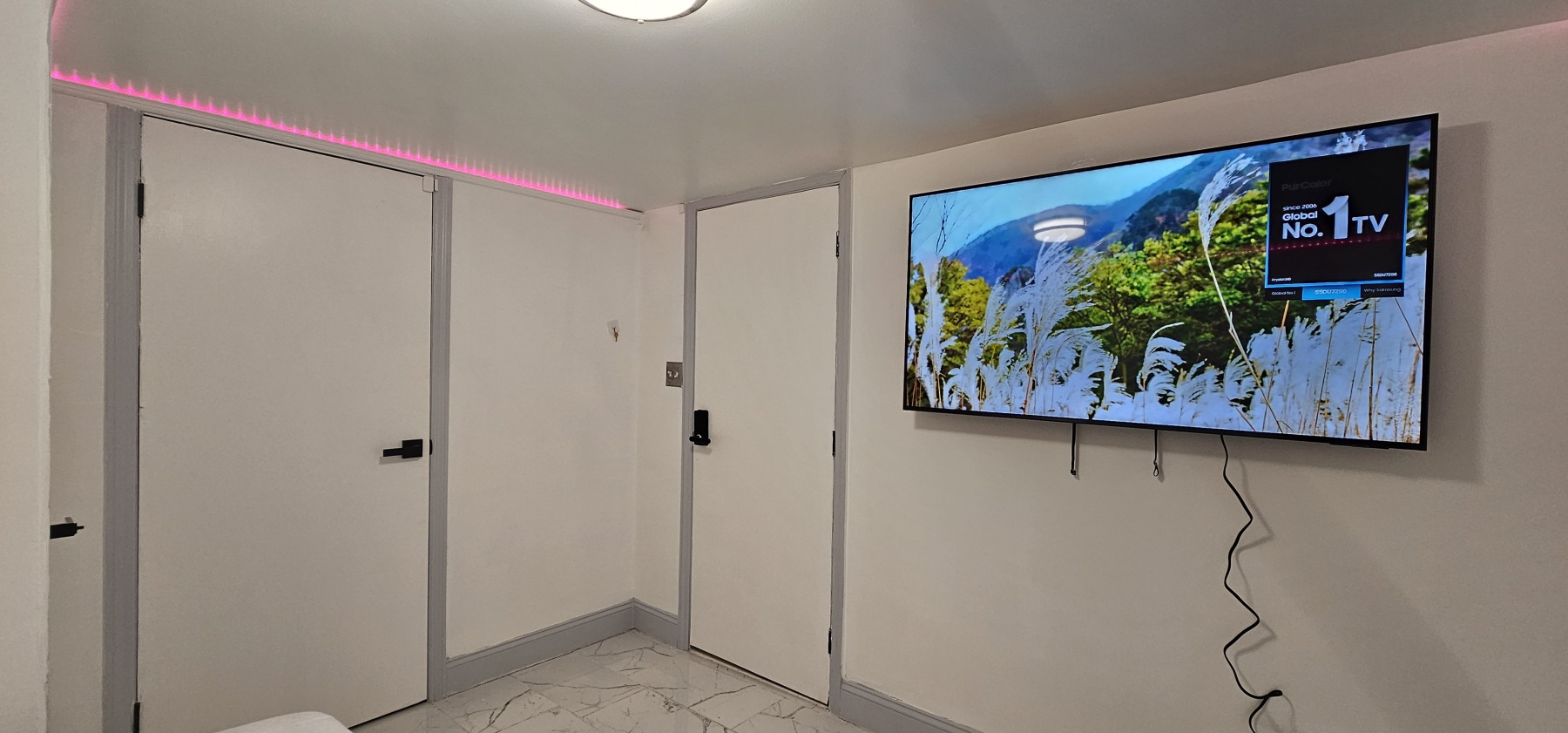 Small room with tile floors, a 55″ 4K Smart TV, desk, chair, ventilation system with control switch, and mood-setting LED stripes.