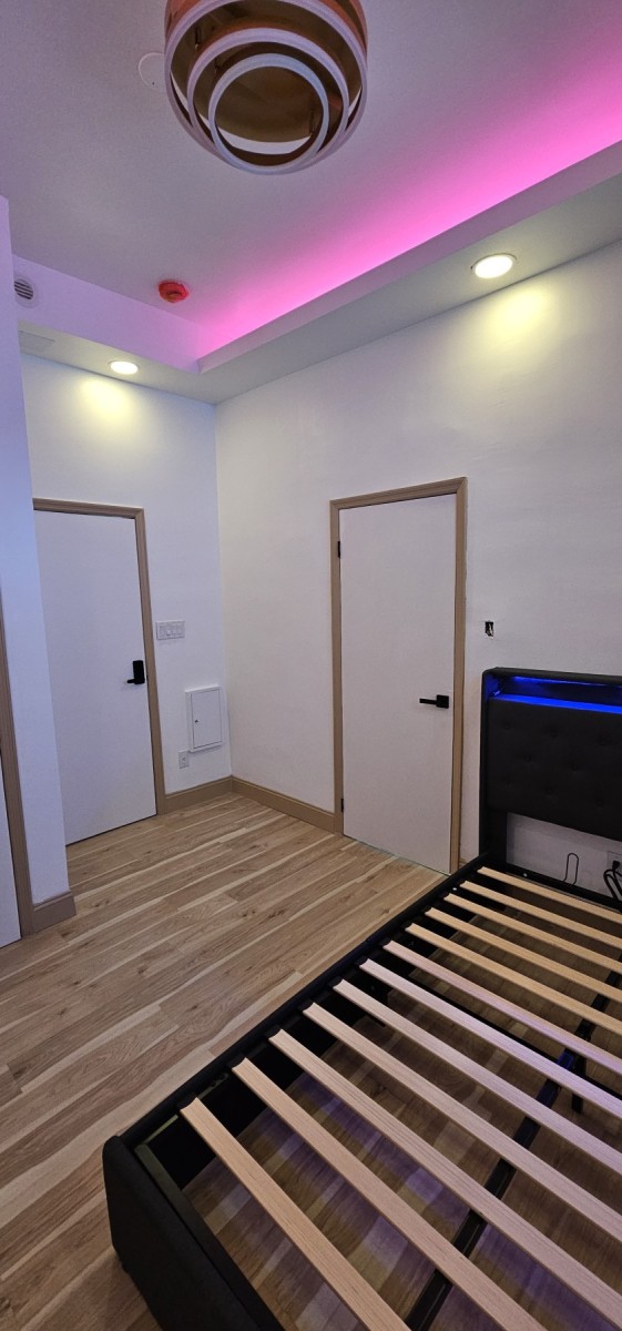 All roommates have professional jobs and are rarely home. This room has high ceilings, a closet, a queen-sized storage bed, and beautiful mood-setting LED lights & no window.